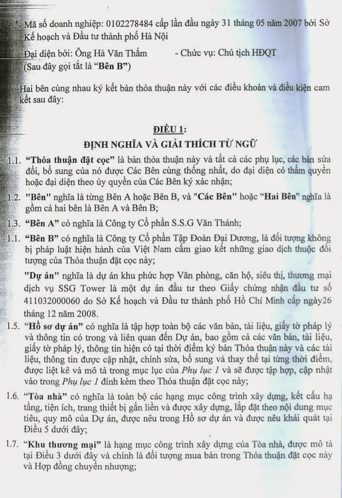 * Dưới đây là Thỏa thuận đặt cọc mua Khu phức hợp Văn phòng SSG Tower giữa Công ty cổ phần S.S.G Văn Thánh (Công ty con của Nguyễn Hồng Phương) và Công ty CP Tập đoàn Đại Dương của Hà Văn Thắm: tiền đặt cọc là 146.305.187.840 VND, chiến 20% trị giá chuyển nhượng 731.141.734.400 VND là minh chứng rõ ràng nhất cho việc Nguyễn Hồng Phương và Hà Văn Thắm tạo ra các công ty ma để rút tiền ngân hàng, không cần có tài sản thế chấp để thực hiện hàng loạt các dự án: